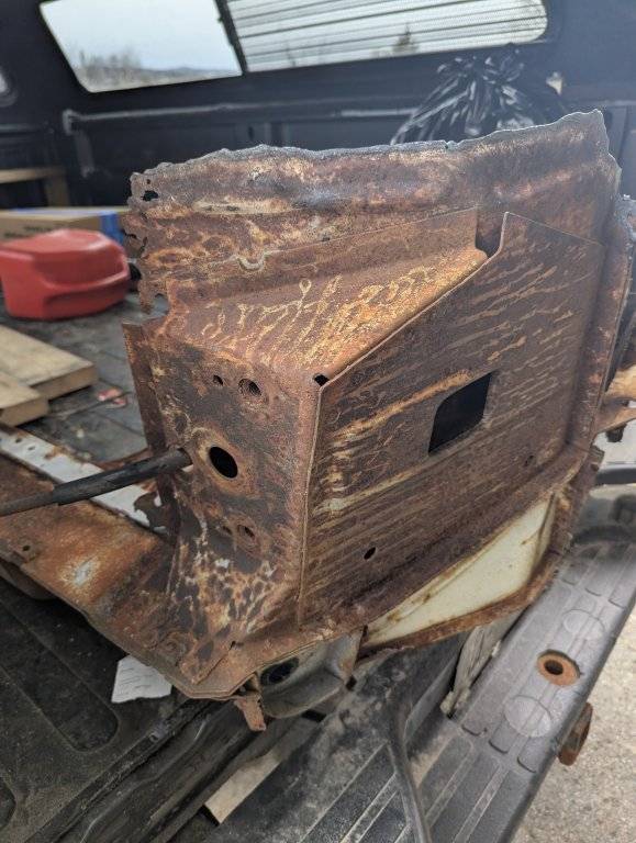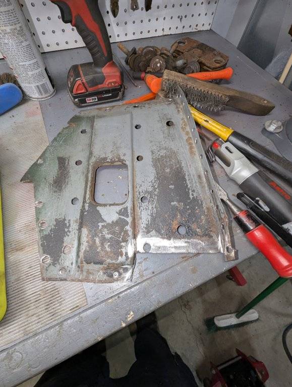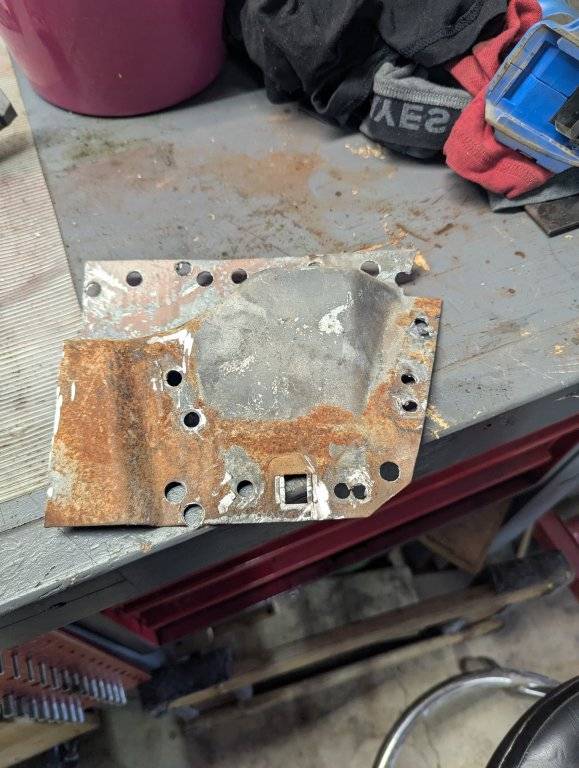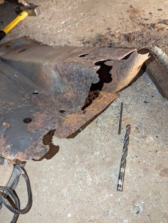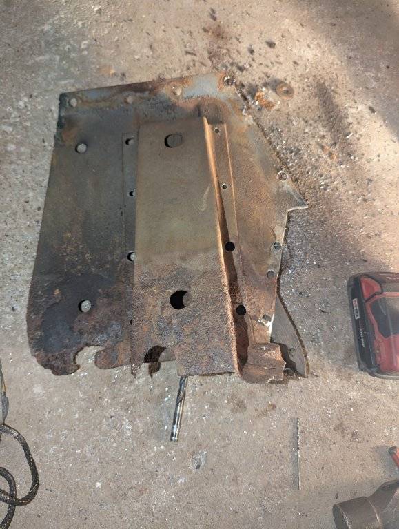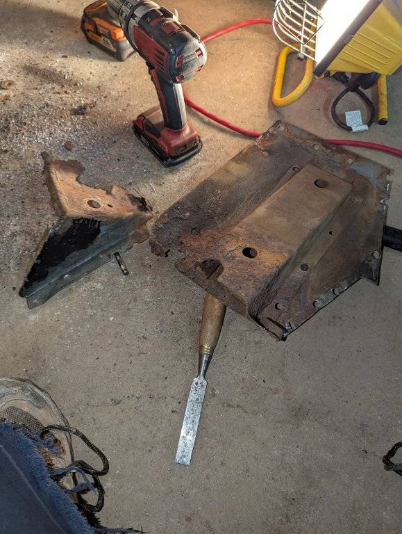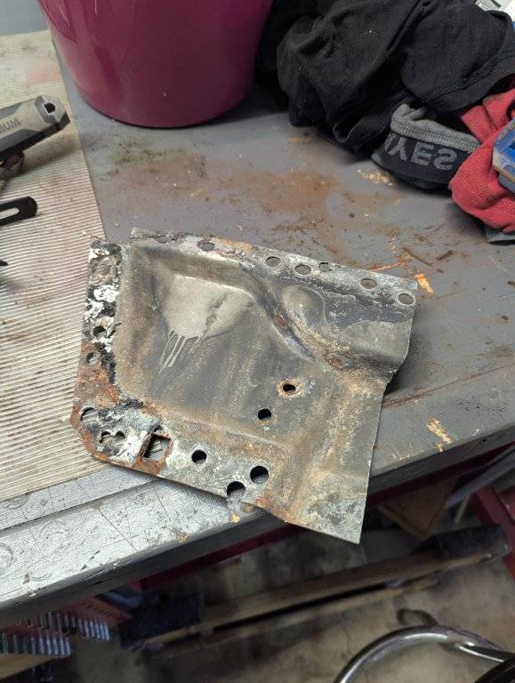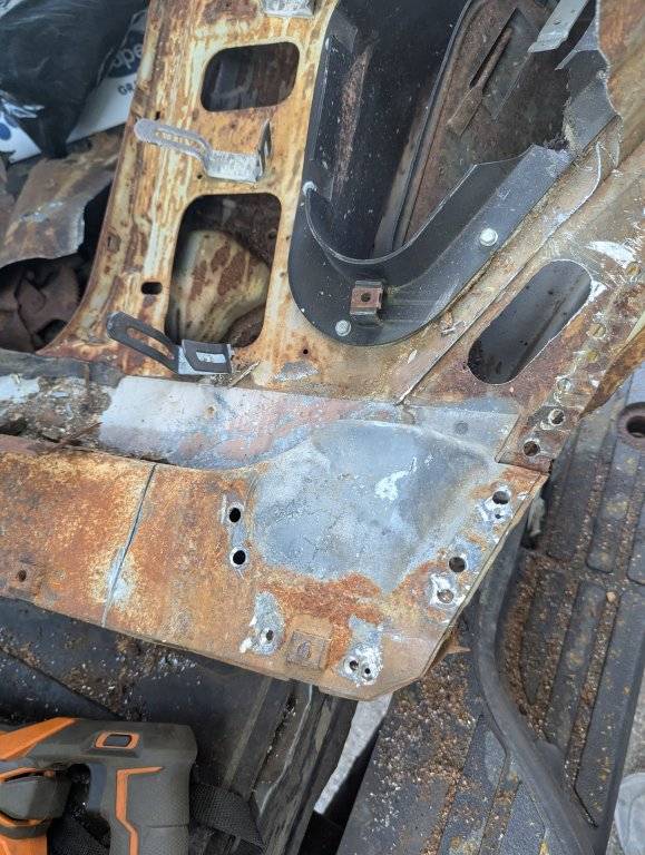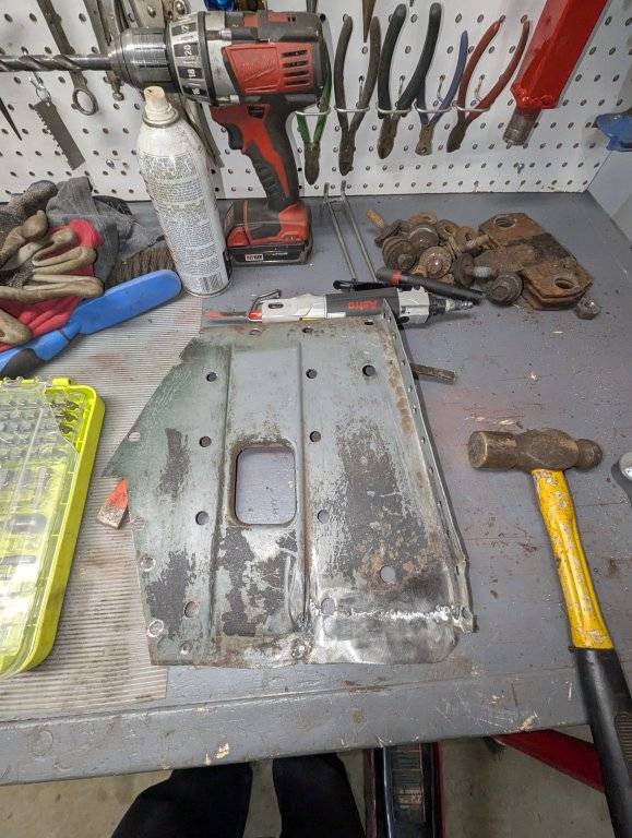 Stripped this mess off the car. The floor patch was laid over top of the old crap. It's a bit soft above the patch, so I'm going to bridge the gap with some new metal.