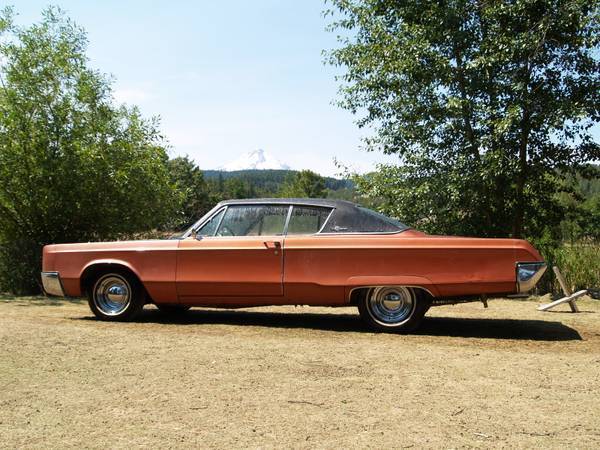 1967 Chrysler 300 survivor 2-door hardtop. 51,000 original miles. Garaged for 25 years. Excellent running condition, drives well, stops well, shifts smoothly, 440 V8 engine 375 hp., glass pack dual pipe exhaust, 4 barrel Holley double-pumper carburetor available, but not on car, Edelbrook manifold available but not included in the purchase price. Spring hanger lift kit on back. Chrome parts are excellent. CD player with dual speakers in the back. Black interior. Power brakes, steering, windows; back 2 don't work. No AC. Vinyl needs replacement. Gas and temperature gauges don't work. $5,500 firm. Dennis, 541-296-8878