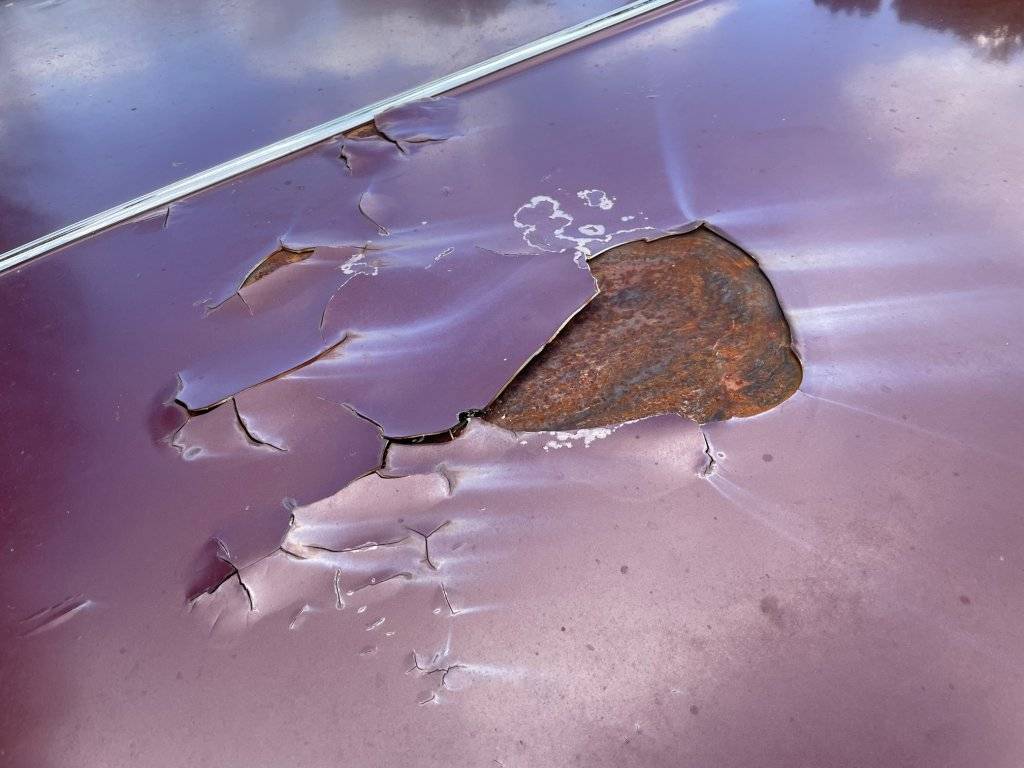 That's on the pass side of the hood. some of the paint lifted, and moisture got underneath and lifted more. It looks worse than it is since I pulled a large chunk off to make sure that metal underneath was good, which is is.
