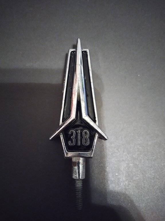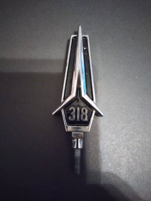I have a 1967 318 Hood Emblem that appears to be an original part not a reproduction, based on the light pitting and aged look of the part. That being said this would be great for a driver quality car. This is not a show quality emblem but would present well. The black background has been touched up with black hobby paint enamel and is not faded. This is posting is for just the emblem, the base and retainer were reused on my current car.