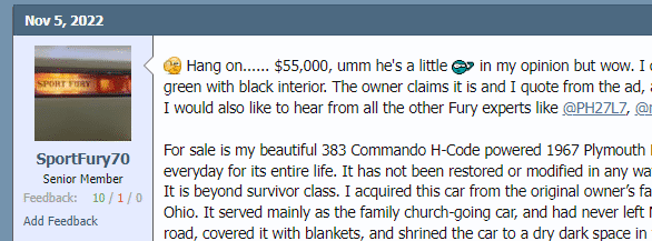 *It is an absolute must that you see an additional 136 excellent photos and videos of the car with many captions and descriptions here: FOR SALE: 1967 Plymouth Fury VIP Hardtop 383 Commando H-Code. (@383vip) • Instagram photos and videos You may not have access to that page if you don't have an Instagram account, or if you're not signed in. I suggest signing up with a little b.s. account in order to see the extra photos and videos. You can always cancel it later.
