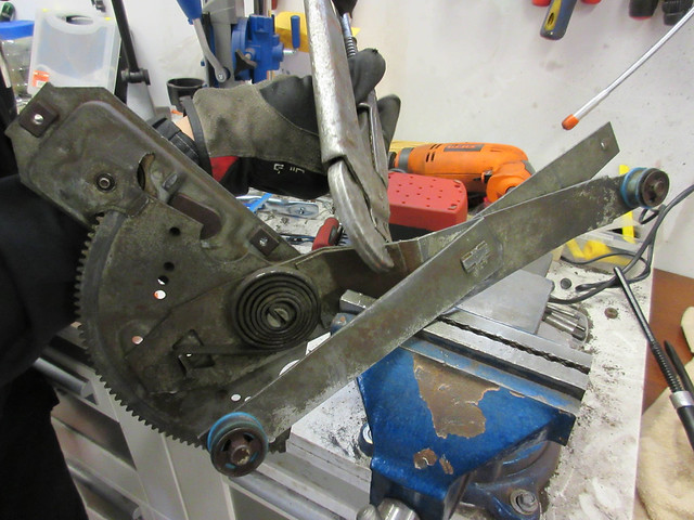 A while backwards in this blog I posted about the broken guide part in the quarter window. Well, the glue did not hold and there obviously was something wrong with the regulator. I had to take both sides' regulators out and compare them and tadaa... The left side regulator had bent so that it could not have worked. Either it has happened a long time ago or then the first painter who I ditched had bent the part when dissambling the car.