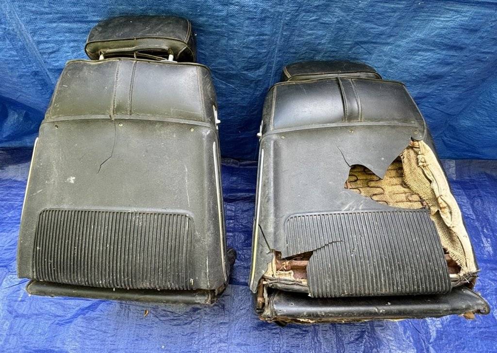 Seatbacks attached but are damaged. The chrome moldings on side of seatbacks are nice condition.