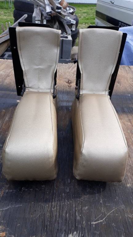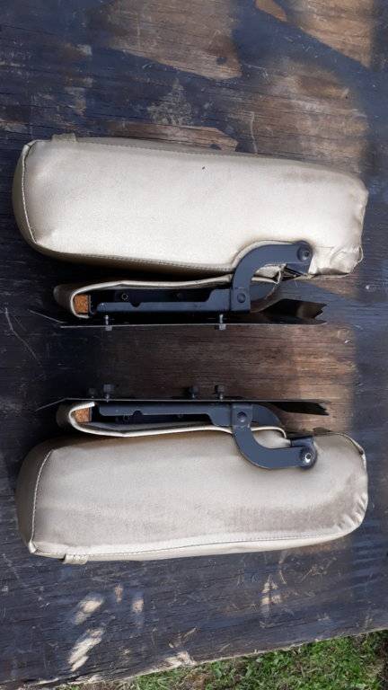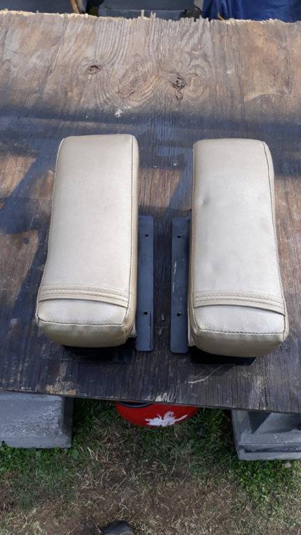 These arm rests came from my 68 T&C. Split bench seat came with optional passenger recliner and head rest as well as these dual armrests. These are a metallic tan in color and have a very small amount of threads coming out in back where the stitching ends. I'm assuming the wood is factory but your guess is as good as mine. Cushions still soft and handles fully attached. Overall, very nice with correct attachment nuts and plates. Asking $80 for the pair. PM with any questions. Located in the Topeka KS area.
