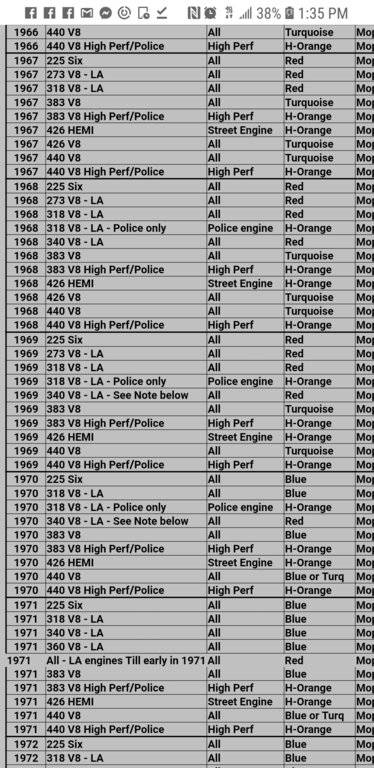 Color looks to be industrial red to me. Remember police cruisers hemi orange color with both 383/440, I think most of the rest were turquoise. The Windsor plant was known to use red (Maple Leaf) on both the 383 and 440 engines, but I do not know if that was still the case in 1969. Did anyone notice that there are two different carbs on this engine? Ad shows the after market manifold with AVS and lots of nut hulls on the intake. Photos above show a Holley carb. Wonder which is on the car now?