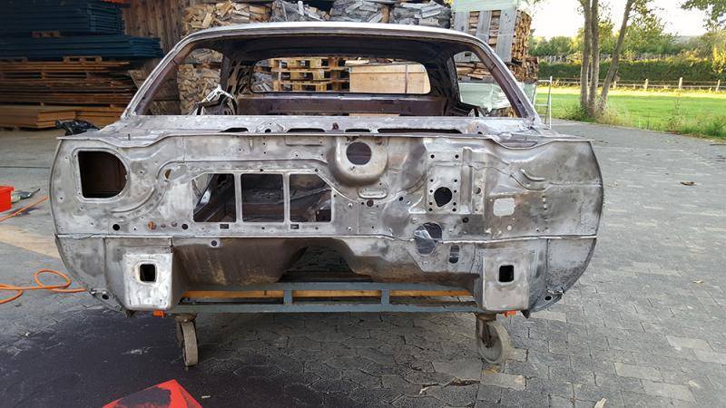 Finally, after 4 Days of blasting the hell out of the car, it was ready for the rust converter treatment. I used FERTAN, a really great product. It's a rust converter and wash primer. It creates a overpaintable protective layer of zinc oxide. I will apply epoxy primer directly on this coating next year after welding all the rosty panels I found.