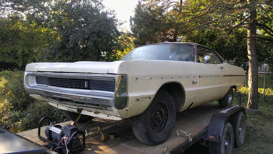 The 383/727 is long gone, at some point it had a 440 in it. Dave bought it in 2002, it's been stored inside since then. It's a factory Disc brake car which is nice, it doesn't need floors, which is nice, and best of all, the green 70 I had will provide most of what this one needs.