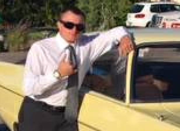 Used car salesman, he's gesturing on how this car will put him "over the top".