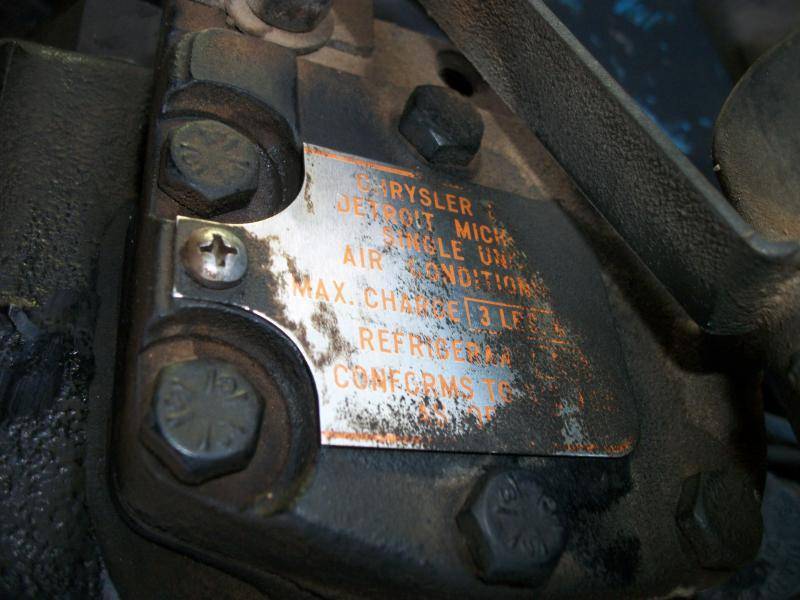 There was a factory stamp in yellow paint that went in that location on the RV-2 a/c compressor. If you want to see all of the possible paint colors, stamps, etc., check out the restoration parts area of the Mopar hobby. They can be purchased new for letter-perfect A/B/E body restorations, but many cross with C-body cars too.