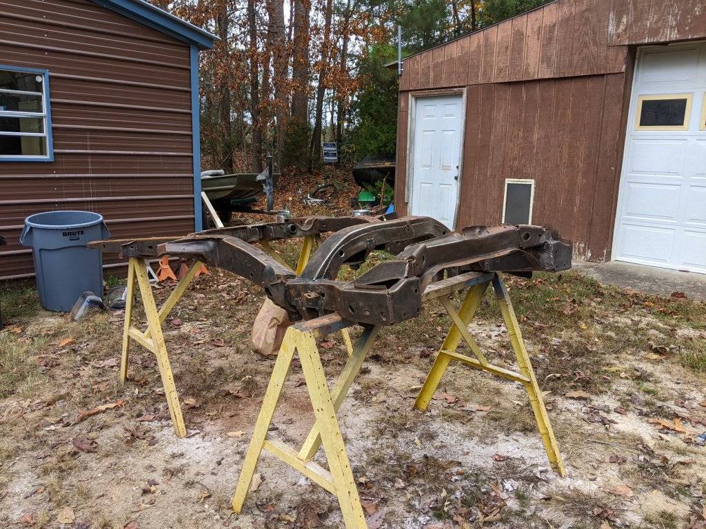 After 48 hours and 2 scrubs in the utility sink, upper control arms look decent. They will get sprayed with brake cleaner before being painted. My friend Jerry has a shop press. Because of lacking space and infrequent need, I do not. Important to clean up the control arms so I don't mess up his press.