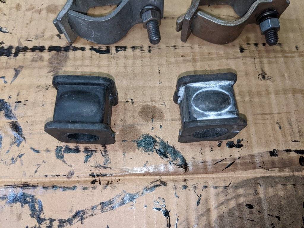 I followed Alan’s advice @MrMoparCHP and installed them with white lithium grease after removing the original bushings. The original bushings had looked good, but they cracked pretty badly as soon as I started installing the sway bar. I removed the old bushings with a chisel and a hammer. Plenty of rust dust. Needs clean up and touch up.