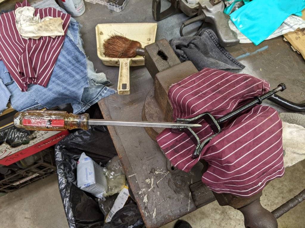 I made this fitting out of upper flange of a broken link and used it to hold the bushing in my vise while I drilled it out.