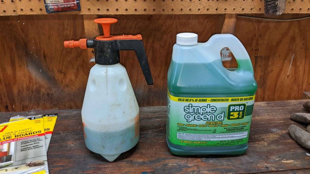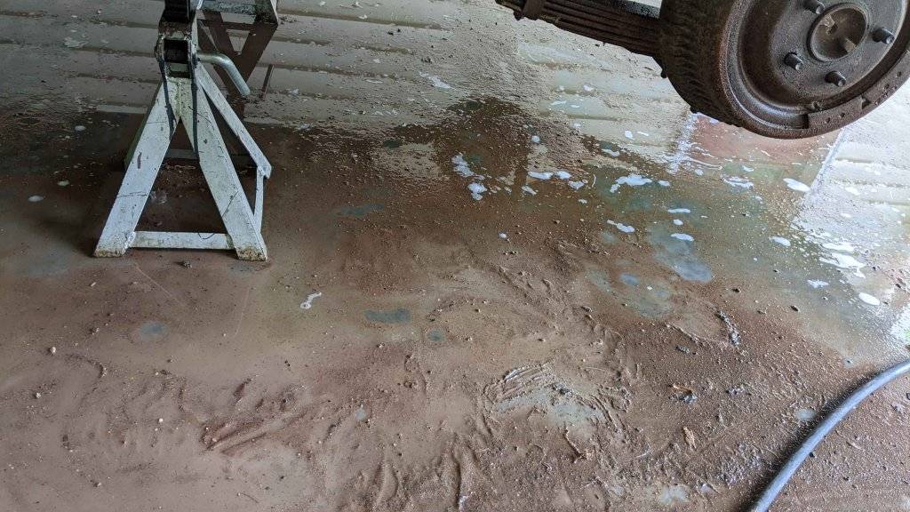 Power wash: I power washed the engine compartment, front subframe, undercarriage, rear subframe, rear axle, springs, front suspension, wheel wells, and sides and front of body. I then followed Brian's advice and put Simple Green into a 1 gallon pump spray bottle that I bought at Home Depot too. Essentially you pump up the bottle,. Then you can hold down the trigger and it sprays. I sprayed the entire area above. I let it sit for 15-20 minutes. I fired up the pressure washer. And washed it again. Over the 3 hour process, tons of red clay came down along with grease particles. I used the pressure washer to spray all debris off the concrete and out in my yard.