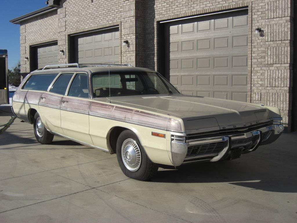 1972 Dodge Monaco full size station wagon. Six passenger. Very good to great condition overall. Tan exterior with "woodgrain" appliques and light brown interior. Exterior paint is 100% original and in good/very good condition, the "woodgrain" sides are somewhat faded. A good polish/wax job would work miracles on such a good and solid base. There is a very small ding on the passenger side rear quarter panel by the tail light. The three section tail light lens is cracked in the middle section and has been repaired with lens tape. Script letters (Dodge) on the tailgate were loose and were removed in order not to lose them. Have most of them in a bag in the glovebox. I just broke the glass in the tailgate by accident, therefore I'm reducing the selling price. (A complete tailgate with glass has been located from a reputable salvage yard - Murray Park - priced at approximately $700+-. Not included). Car has no/very little rust (California car). Interior condition is in great shape (cabin) and good to fair condition in the (utility) rear compartment. No tears or rips in the seats/door panels which all present extremely well. Same with the carpet, despite some fading in places such as the cargo area floor panels. Hard vinyl rear wheel covers show some scratches and slight fading/wear. Glass and rubber are in great condition, except a small crack on the passenger side of the windshield. Original 440 CU V8 and 727 Torque Flite automatic transmission operate well. Car has only 42,850 miles (believed to be original based on overall condition of the car).
