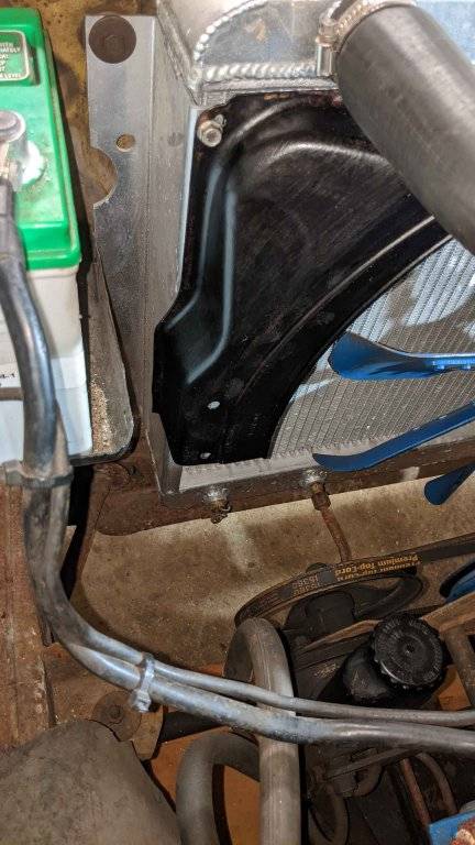 It took several test fittings along with more drilling and grinding, but eventually I got everything to line up. Tightest area was the curved edge at bottom of the lower half where I had about 3/8 inch of clearance. If you have a factory 22" radiator, you should have about 17" between top mounting hole and bottom for fan shroud mounts. A lot of this could be avoided.