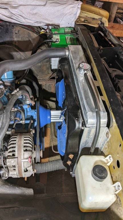 Test Drive: the factory 18” fan did not hit the shroud even on hard acceleration. In revving the engine at idle using the carburetor throttle linkage, I found that the fan does not draw much air through the radiator at idle, but it draws a huge amount as the engine is revved up. I tested to make sure the fan was mounted the right way by placing a rag over the front of the radiator. Even at idle the fan could hold the rag against the radiator. So it is always pulling air.