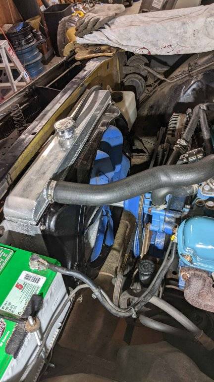 Champion EC2374 Aluminum Radiator: 22 inch core, installed in my 1972 Plymouth Fury, along with 18" factory fan. The car runs well for medium distances, like 34 miles one way. However if I stop somewhere on the way home in the summer heat, I do risk vapor lock after I restart the car and get going up the road. I decided that the cooling system was not doing it’s job perfectly. Most cars need a fan shroud, and my car is no exception, even though it doesn’t have air conditioning. Just so you know, the factory radiator that was in the car when I bought it and that began to leak, had no fan shroud mount on it.