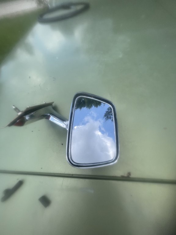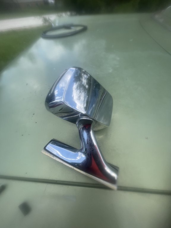 For sale is a right hand exterior mirror for 1974-77 C Bodies. This is date coded March of 1977 but will fit cars before and after. It has 3 mounting studs. Comes with gasket and reinforcement plate. $75 plus shipping from 60031