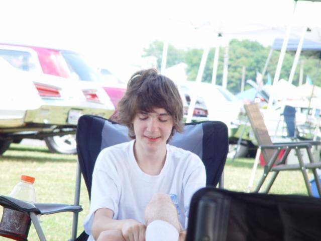 Here's a picture of Dave son after his Grandpa woke him up and told him the Daisy Duke contest was about to start. Grandpa asked if he wanted him to go with him....of course you know the answer. LOL!