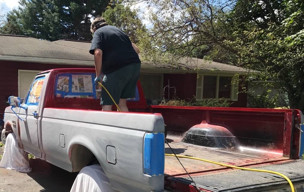 My youngest son has an '88 Ford F-150. When he shows up in it, the theme from Sanford and Son starts playing. He's had a run of bad luck and his older brother and I decided to paint his truck while he was out of town. Nothing fancy... just make it one color and look OK driving down the road.