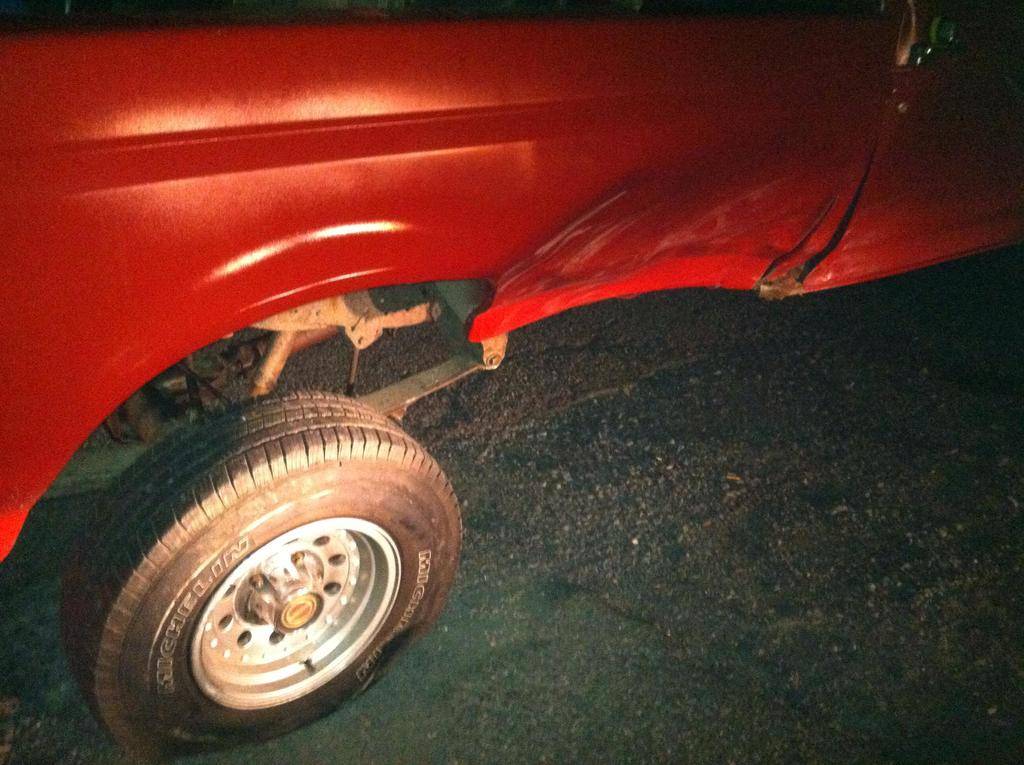 Anyway... She hit him so hard that it screwed up the leaf spring and blew the tire. She spun him around and into another car.