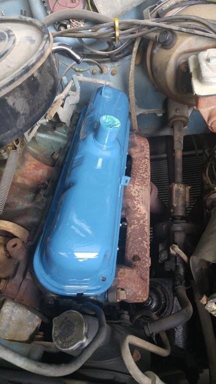 I did a such a beautiful job on the valve cover, but I don't know what I was thinking. It's supposed to be turquoise, not corporate blue. Got to get me some and redo it. Good thing I only did one. It's just laying there to cover up the rockers, I didn't paint it there.