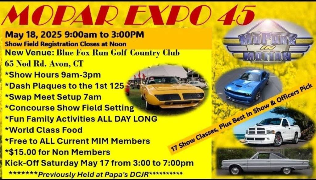 The Mopar club I belong to is having its 45th Annual Mopar Expo Cruise Night, Show, and Swap Meet on May 17th and 18th 2025 at a different location this year than previous years at a country club in Avon CT. I posted all the information below but the club will be having a cruise night on Saturday May 17th from 3PM-7PM, and the show on Sunday May 18th from 9AM to 3PM rain or shine. Paging @1968Chryslers, @cbarge, @68_fury_ragtop, @O_Knut, @Big_John, @polara71, @67valiant 100, @SIPLOWGUY, @75LandYacht, @Turboomni, @polarus, @GJS, @Yeahrightgreer, @stain, @BigCah, @Steve Triplett and anyone i'm missing. Hope you all can make it and hope to see some of you there!