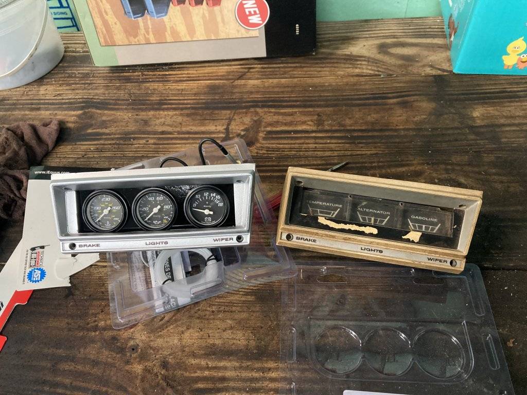 Took a factory gauge cluster that was cracked and missing the lens and turned it into a modern trio 1.5” gauge holder. Removed the back of the casing with a cut off wheel and used 20ga to make the insert. It is held on to the front face by mechanics wire bent at a 90 on top and small holes drilled between the gauges. To make the gauges fit I had to remove the bottom recessed section of the face and welded 1/4 nuts to the bottom of the front steel face to give it a small space between the gauges on the bottom.