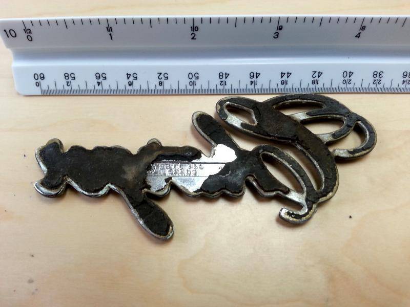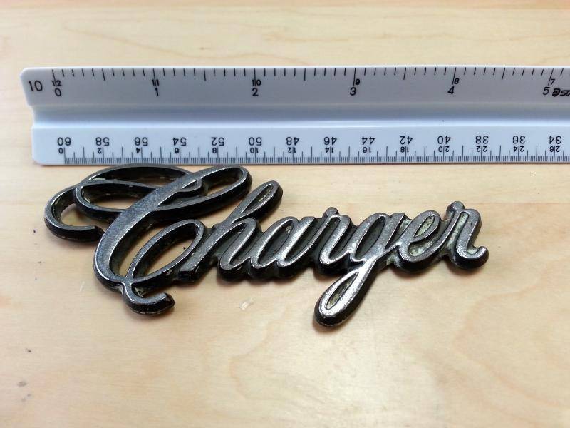 Also 70s Charger script emblem -- metal, stick-on, no pitting I can see. FYI the top scale in the pix is in inches and 10ths. The numbers on the back are 3811 386 63259. Local Austin/central TX price: 1 6-pack of an interesting IPA or stout, to be consumed on-site while telling lies about cars we've had/raced/etc. Distance price: a few bucks via Paypal.