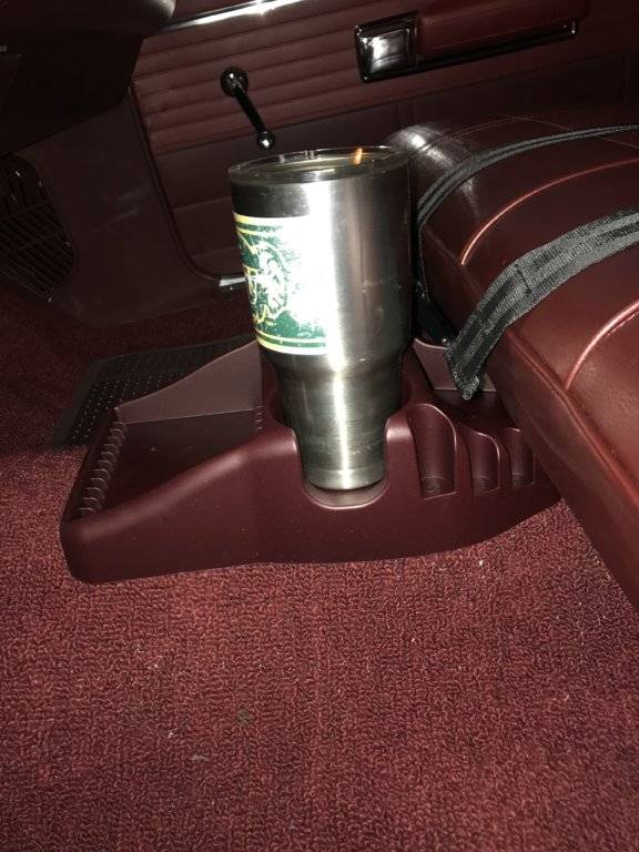 I was getting concerned that I didn’t have a cup holder for my drive to Stillwater. But I happened to find one at Autozone for $4.99. A little Velcro and Aztec Maroon Suede dash paint and I was in business.