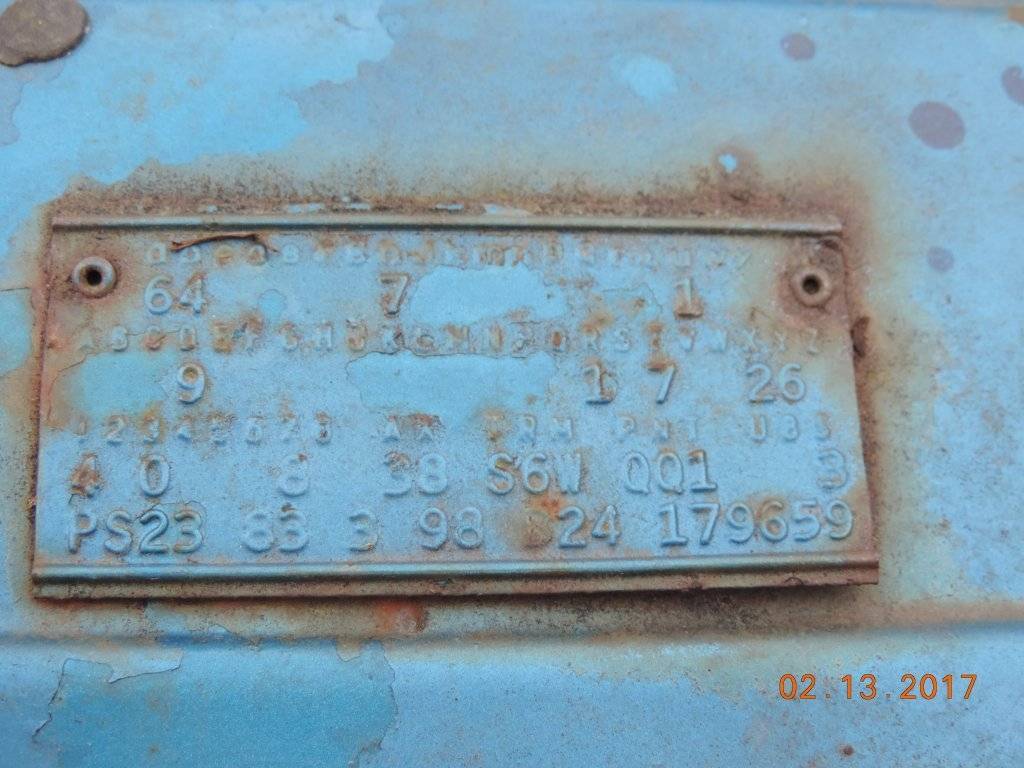 Ok, this tag tells me this is a '68 Sport Fury two door hardtop with a 440HP, 4 speed manual, 8.15-15 b/w 4ply police grade tires, bfd/spd Nov.24, day/night mirror, belt mouldings, a locking gas cap, 3.31 9.25" axle w/suregrip, black & white bucket seat interior, bright blue metallic paint (top & body), white stripes, pwr frt disc/rr drum brakes, a.M. 2watt radio, tach, tinted w/s, black v/roof, ctr console, fdr mtd t/sig lts and it was a sold car.