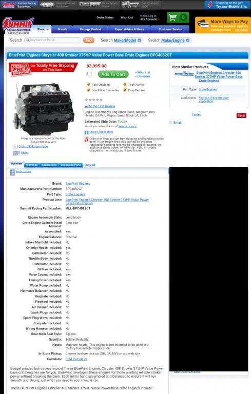 I also took a look at these, These are just a little more for a stroker 408 and seem to be held in a higher regard. They've been dyno'd and have a warrenty. Any thoughts? Chrysler Performance Crate Engines