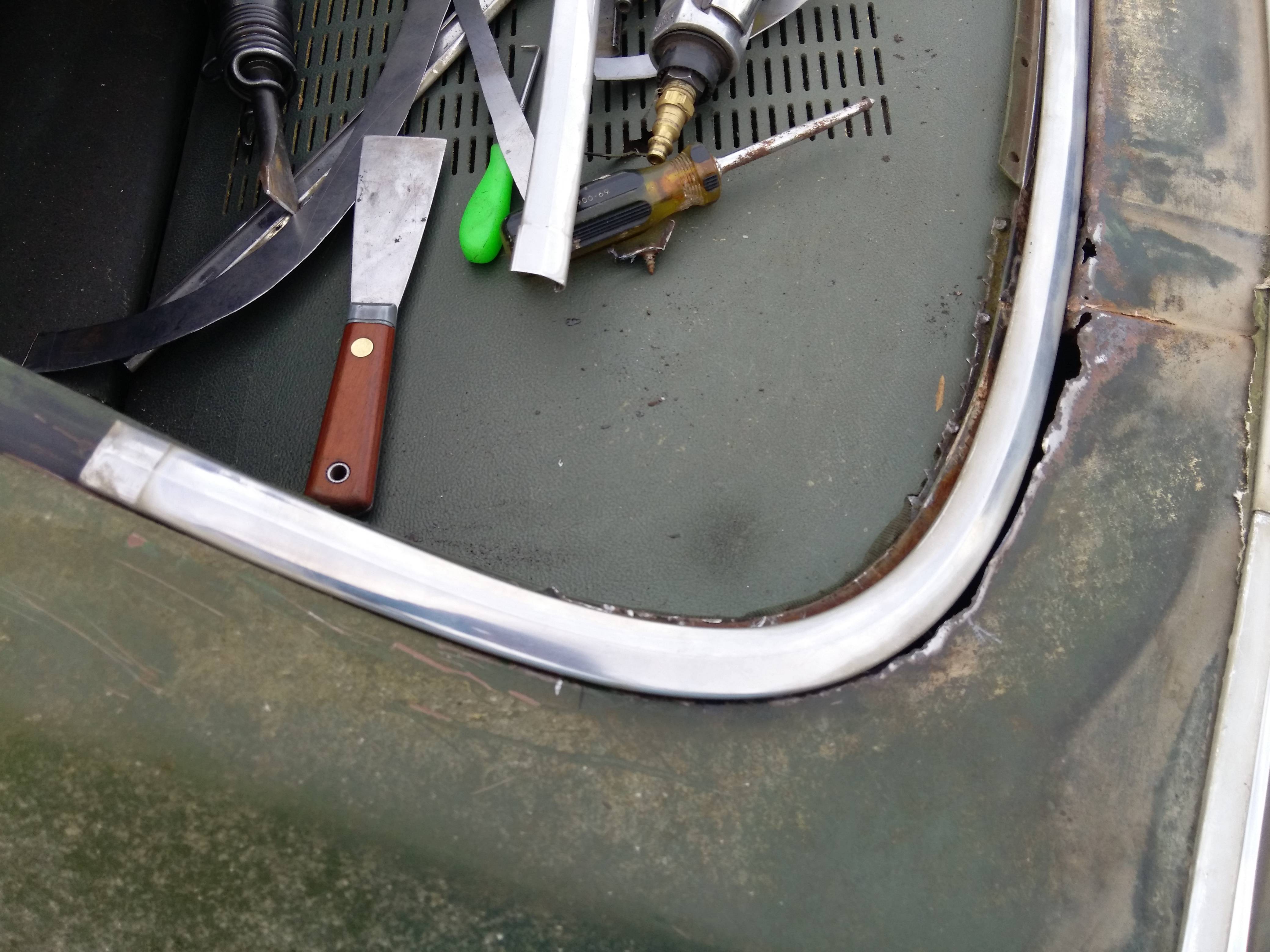 You can see the patch panels on the package tray I've cut out and plan to weld into the repair in the above photo. I used the chrome trim as a guide for making the patch piece that the window rests on. Its the same shape and swoop as the channel itself. Pretty handy so far.