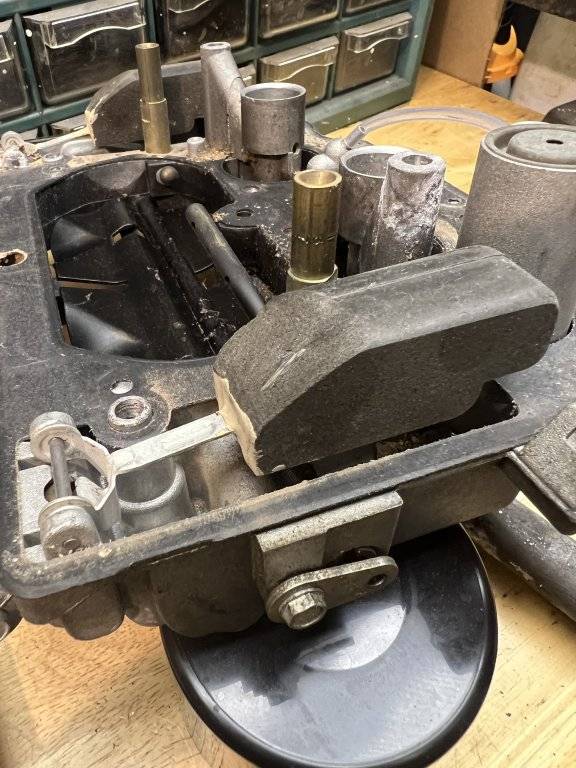 Some measurements to see how much I needed to extend the slot in the kickdown bar. Holley linkage sits an inch further back than the Thermoquad and about 3/4 inch higher. Distance between center lines of throttles shafts to the linkage points are about the same (with my fabricated adapter). But being higher on the Holley, I’m running into the bottom of the air cleaner with the Cruise control linkage by about 3/8 of an inch. Will need to relocate it outboard and down. I have a longer link to use to make up the difference.