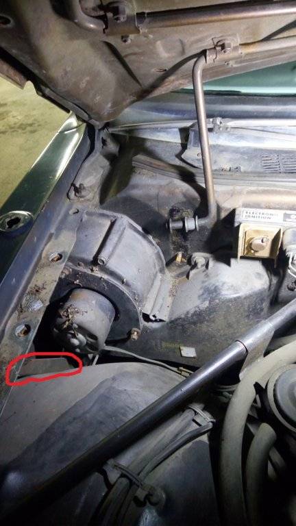 To acces to it, I removed the hood compensator and unbolted the inner fender panel, as mentionned in the Haynes repair manual. I can't remove in totality the inner fender panel, but it is not really a matter. My big problem is the bar, circled in red in the pic, that seems to be bolted close to the subframe (down) and welded to the fender (up). And the bar is bloking the blower motor, impossible to remove it from its airbox.