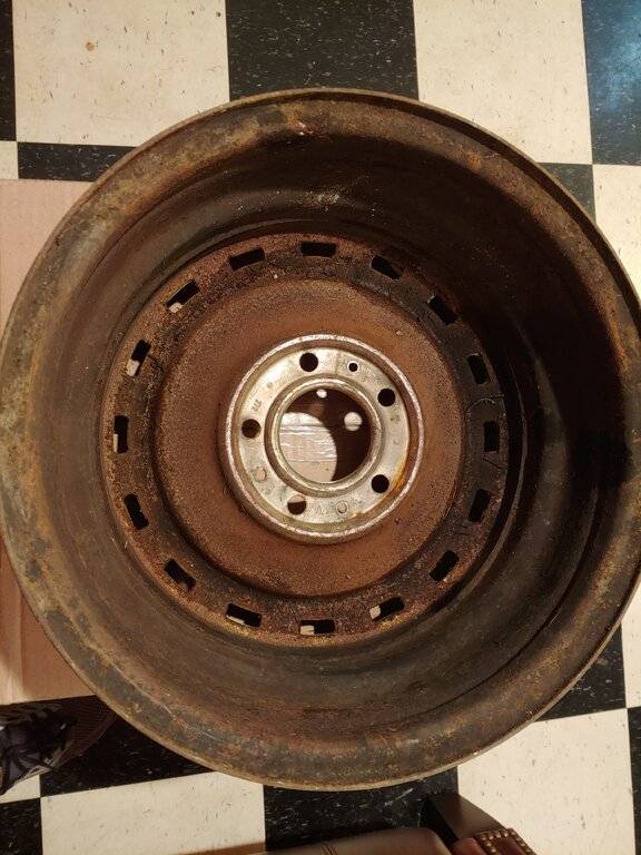 That’s cool, that there is chrome underneathThe lettering on the red ring on the AMC Volcano cap is embossed.I am presently redoing a set of the Chrysler roadwheels using the AMC cap I removed the ring and left it chrome.I painted the splints black.Instead of painting the center of the wheel argent color I stripped the paint and polished the chrome that was underneath.i have to paint the rest of the wheels yet I stripped the wheels using Apple Vinegar soaked absorbent pads & put them in garbage bags let them sit for 7 days they are completely devoid of rust/paint now.
