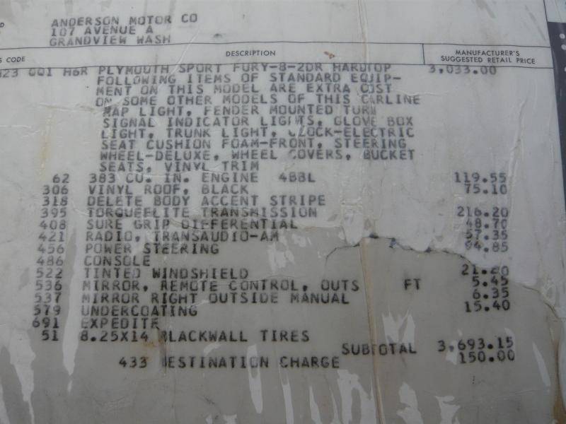 Thanks for the quick response. Yep! your right...the window sticker says "sure grip" differentail. I didn't think Furys had a black hood option. What is strange, I can't find any sign of original red paint anywhere on the bottom of the hood even in the hard to get to spots under the reinforcing structure. It was a woman who originally purchased the car. The lady passed away a number of years ago and the car just sat in an out building. Her son said the car had a black hood as long as he can remember.