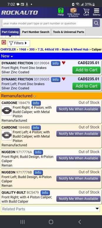 I'm looking for rotor's, pads and calipers for my 68 Chrysler 300 that came with front disk brakes. Having a hard time finding parts especially the calipers. I would appreciate any information someone might have. Thank you