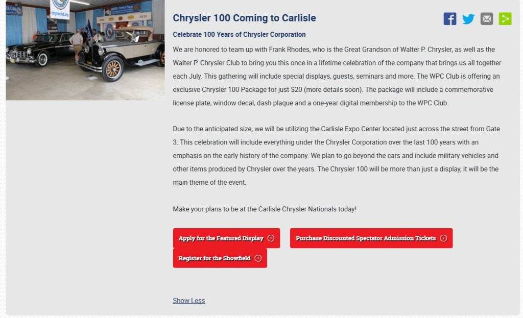 Sending a reminder for everyone that there is also a Chrysler Centennial exhibit this year, put on by the WPC (Walter P. Chrysler) club. Not sure exactly WHERE on the grounds it will be, it may be at the EXPO Center across the street, worth making a little extra time for, and I'll be going up early on Thursday to see it.