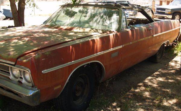 Here we have a 1969 Plymouth Fury Convertible, it is a rust free car, I cannot find any spots with rust not even in the floor. This car is an original California car and has been in the desert its whole life. The interior and convertible top has been baked to shreds but the car is complete, seems to have all the parts there with all trim and chrome. Bucket seats and all the frames for the seats are there.