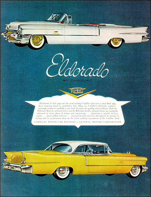 1956 Eldorado. Check out the "Dagmars" ("bullet" bumpers that showed up in the 50's - Buicks, Caddies, Mercs, and others) on this baby.
