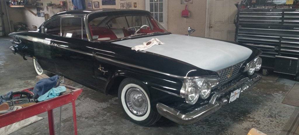 I took some photos of the '61 during Winter hibernation but Spring will be here soon then its car show and cruise in season. The reason why the hood is in primer is because it had to be stripped down the the metal and had to be redone The paint was lifting on some spots on the hood . The car will be covered except for the hood of the car when it gets painted .