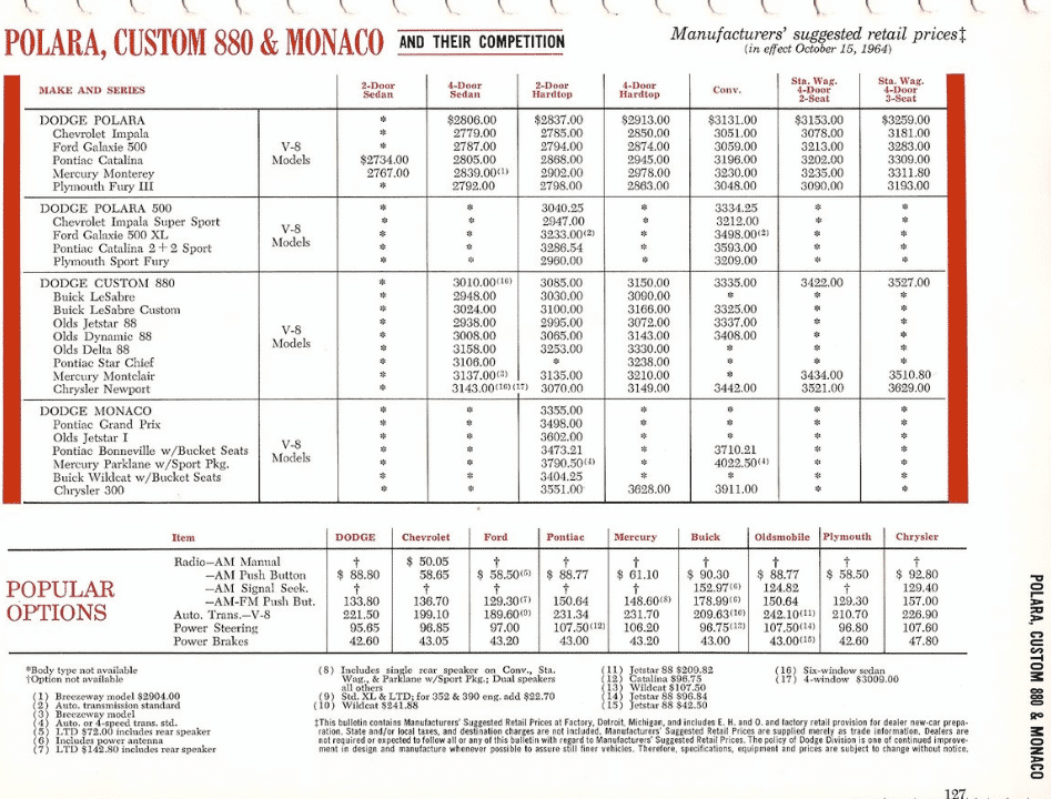 Polara is base level model, Custom 880 is the high line model and both trims available in 2dr, 4dr, conv, and wagon. Custom 880 also offered six window sedan. Monaco was 2dr only with highest trim level. Whew, can’t imagine assembly complexity through the trim shop.