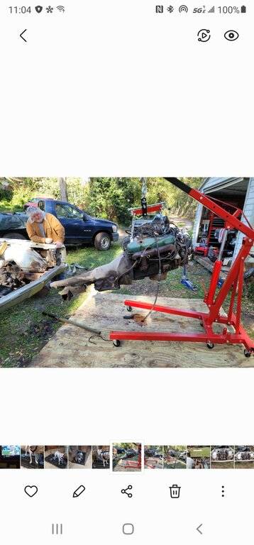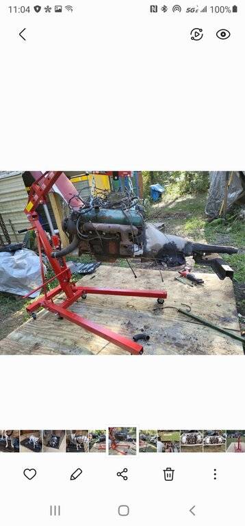 Here I cleared the core support with room to spare! My secret? 1.) I cinched up the leveler chains be 3 links, eliminating the play in those, and increasing the motor altitude and 2.) I had the car ON THE GROUND, permitting it to roll when needful, and 3.) I used a couple sheets of 3/4" OSB I had got from a now departed neighbor. I refrained from using this at first from fear of the hoist wheels destroying the stuff, as indeed happened when handling a 400 with TF 727 attached 4 yrs ago. BUT, the caliche beneath the OSB was DRY for this exercise, assuring a firm bed which supported the glued woodchip board well enough to allow it to roll with little damage.