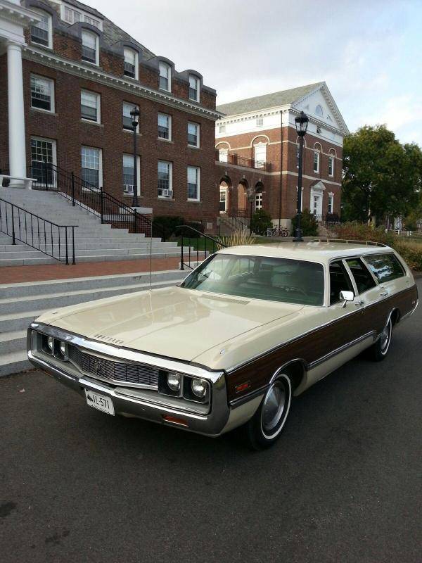 Up for auction we have a beautiful 1971 Chrysler Town & Country Station Wagon. This car currently has 77,614 original miles and is powered by the optional 440 c.i. V-8 also original to the car. Options include A.C., power windows, split bench seat with power 6-way on the drivers side and reclining back rest on the passenger side, remote drivers side mirror as well as a manual passenger side mirror and front disc brakes. Car also has the 3[SUP]rd[/SUP] seat in the rear making this a 9 passenger model. This car is essentially a survivor with mostly original paint , nice chrome and a beautiful original interior without a rip or tear to be found. The only rust to be found is a small spot on the inside edge of the spare tire well (seePhoto). I purchased this car a little over a year ago after a lengthy search since my parents had an identical Town & Country when I was a child and have put over 3000 miles on it since that time. This car runs fantastic and has to be one of the most comfortable cars I have driven, in fact I was invited to the Hemmings Concours in Saratoga N.Y. last fall where the car was voted “Best Car to Drive to California” by the Hemmings staff. The tires are almost new as well as the exhaust system and I recently replaced the brake master cylinder, power steering pump and rear wheel cylinders. The power windows including the tailgate window all work flawlessly as does the power seat. Items that do not work include the A.C., it’s 100% complete with the belt on the compressor, I just never got the chance to try and figure it out and frankly It never bothered me. The gas guage also doesn’t work, again not that big a deal since the car has a re-setable trip odometer and I would set to zero at every fill up, also the AM radio doesn’t work, but I have a spare original radio that goes with the car, I much rather listen to the rumble of the 440, that’s music to my ears! You can see this car was not ordered with the optional roof rack, I was fortunate to find an original and correct rack for this car in very nice shape and have already had the stainless portions of the rack polished. I also found a set of the optional grab handles that are mounted on either side of the tailgate window that help when entering the third seat. Both the grab handles including the shorter stainless trim pieces (also polished) required for the conversion and the luggage rack are included with the purchase of the car and yes all the necessary mounting hardware is also included. While I consider this car to be in excellent condition, it does have it’s share of little touch ups and minor scratches, there is also some minor damage to the right rear door(see photo). My reason for selling is simple, while this car is on my top 5 list, my number 2 choice became available and I simply cannot keep both cars. I am happy to show this car by appointment, I can be reached at 203-219-2962. Connecticut does not issue titles for older cars anymore so this car will be sold with a bill of sale only.
