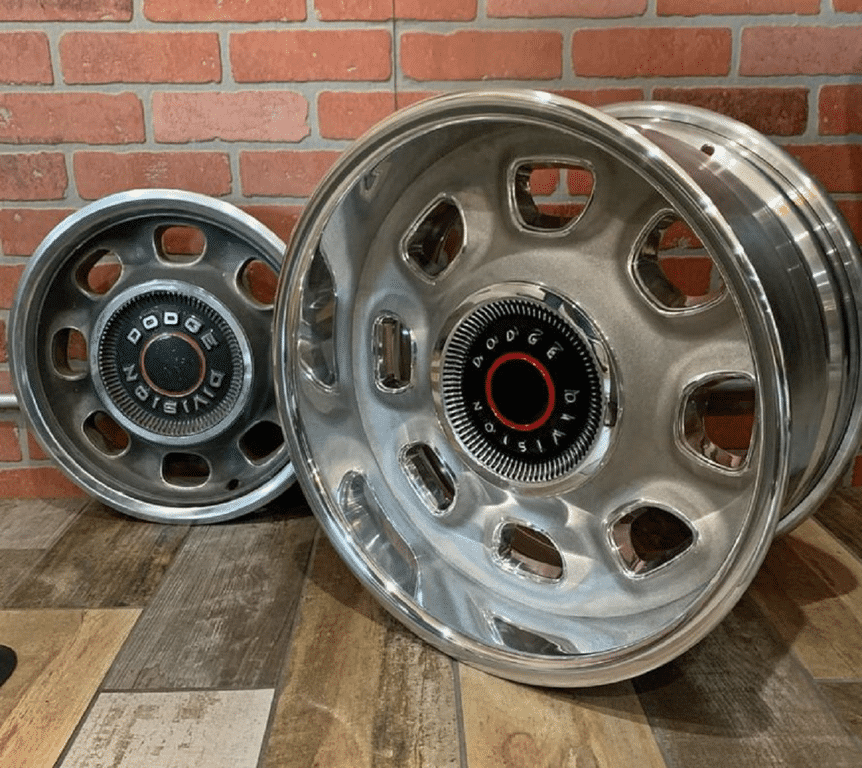 I'll start with one of mine. 1971 Newport, 235/70R-15 tires, 15x8 wheels with 4.0 inch backspacing. Stock front disk/rear drum. No interference, no adaptations.