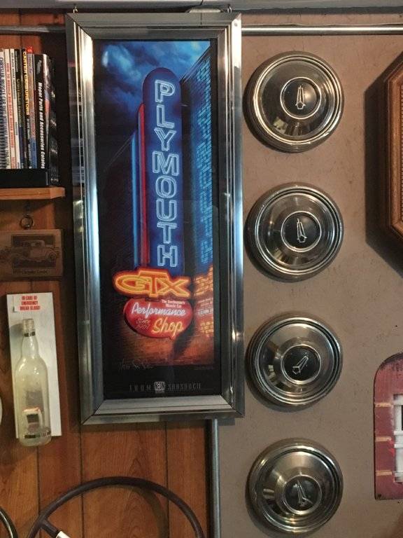 This here is a story about having the right left over parts at the right time. At this years Chicago World Of Wheels my wife & I spotted this Neon print by artist Thom Sansoucie. It really lights up on it own, though a small spot light is even better. It’s sized to fit a cheap black Walmart frame but we wanted something different. That’s were the Beautiful Stainless Steel trim from from the ‘65 Chrysler 300 lent itself. It is a Plymouth sign but the graceful look of the trim adds some grace and punch. You will see soon.