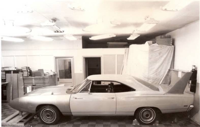 These pics are supposed to be at Creative Industries. I could be wrong but they may have done cars for more than just Chrysler...Why that's there I don't know but it looks to me like a '69 ~ '70 Grand Prix hood. 2¢