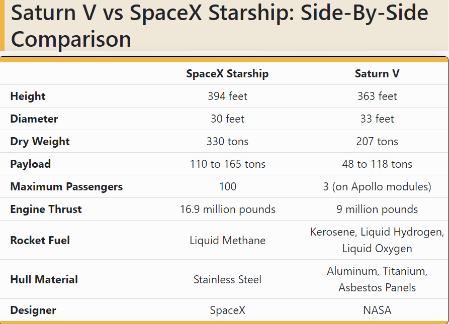 source: What time is SpaceX's 1st Starship and Super Heavy launch on April 17?, Saturn V vs SpaceX Starship: How These Mega Capacity Rockets Compare