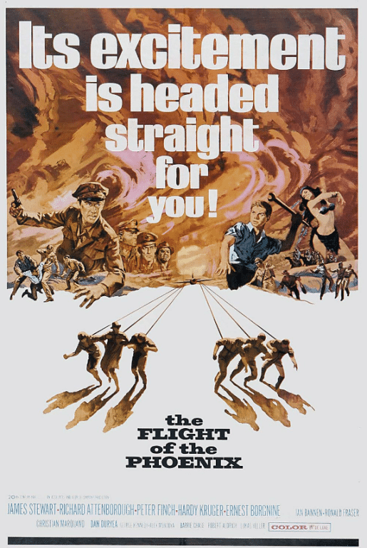 The original Flight of the Phoenix, with Jimmy Stewart as the star. Worth your time if you like some neat plot twtists/character studies in movies. If you havent seen it, I wont spoil it. The plane, with its twin-boom design, had almost as big a staring role as ole Jimbo.
